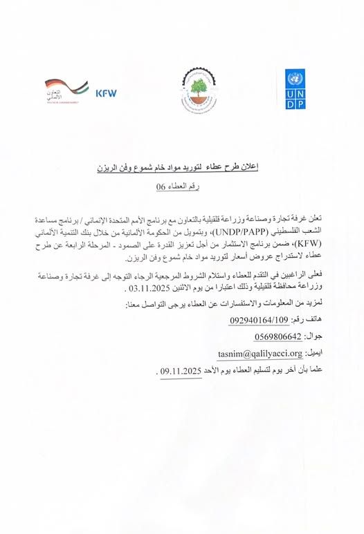 فعلى الراغبين في التقدم للعطاء واستلام الشروط المرجعية الرجاء التوجه إلى غرفة تجارة وصناعة وزراعة محافظة قلقيلية وذلك اعتبارا من يوم الاثنين 03.11.2025