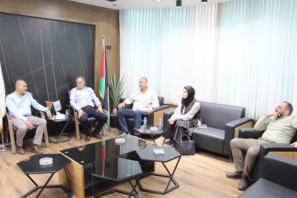 جانب من لقاء رئيس غرفة تجارة وصناعة وزراعة محافظة قلقيلية طارق شاور ومدير مديرية الاقتصاد الوطني في قلقيلية حسام الشاعر، وذلك بحضور عضو مجلس الإدارة ناصر خروب ومدير عام الغرفة محمد قطقط.